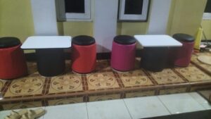 Setelah semua bahan sudah siap, baru kemudian merakit ember bekas cat tersebut menjadi meja dan kursi. Untuk kenyamanan dan keindahan jangan lupa tambahkan bantalan yang terbuat dari busa dan kain mengelilingi kursi.