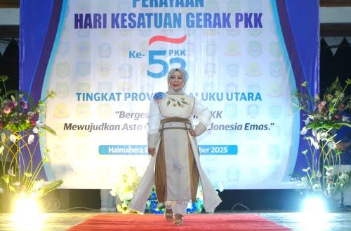 Katalisinfo.com, Tidore — Sumiyati Ahmad Laiman, Ketua I Tim Penggerak PKK Kota Tidore Kepulauan, tampil anggun mengenakan Wastra Khas Tidore Tenun Puta Dino Khayangan pada fashion show Hari Kesatuan Gerak (HKG) PKK ke-53 Tahun 2025 di Lapangan Sasadu Lamo, Jailolo, Senin (13/10/2025).
