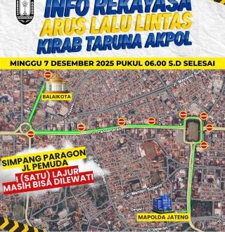 Katalisinfo.com, Semarang – Pemerintah Kota atau Pemkot Semarang bersama Satlantas Polrestabes akan menerapkan pengalihan arus lalu lintas pada Minggu (7/12) pagi besok untuk mendukung kelancaran kegiatan kirab Tradisi Kenal Pamit serta Pelepasan dan Penerimaan Taruna Akademi Kepolisian (Akpol) sebagai warga kehormatan Kota Semarang.